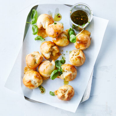 Warm de oven voor op 180°C. Pel en plet de knoflook en hak de verse kruiden heel fijn. Meng de knoflook, de kruiden, de chilivlokken en een snuf zout met de olijfolie. Rasp de kaas. Duw met een uitsteekvorm (+/-7 cm ø) rondjes uit het pizzadeeg en besmeer ze met de kruidenolie. Leg een koffielepel gemalen kaas op elk rondje en rol dit op tot een balletje. Leg de kaasballetjes verspreid op een bakplaat, besmeer ze met eigeel en bak ze in de oven gedurende 20 minuten, of tot ze goudbruin kleuren.