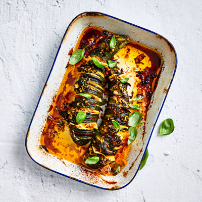 Hasselback courgette met chorizo, oude Beemsterkaas, basilicum-dragonolie.