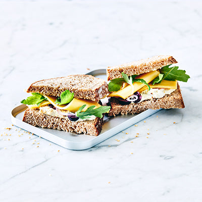 Besmeer het brood met de hummus. Beleg één boterham met de Beemsterkaas gevolgd door de rucola. Leg de andere boterham hier met de smeerkant naar beneden op. Halveer de sandwich en serveer op een bord.