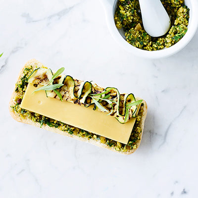 Ciabatta met plakjes kaas, dragon-pistachepesto en gegrilde courgette.